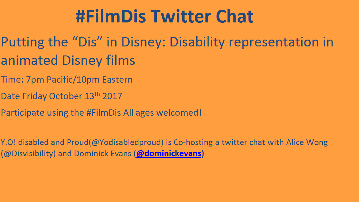 Friday, October 13 7 PM PST Youth Organizing Disabled and Proud @yodisabledproud along with co hosts Alice Wong via @disvisibilty and @DominickEvans will be hosting a #FilmDis Twitter chat to discuss disability representation in Disney animated films. we will not be including Disney’s amazing films created with Pixar…. That’s a Twitter chat all its own.