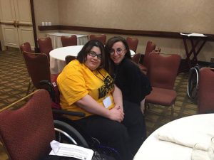 Photo Description: A Woman with long Brown hair and Glasses smiling and standing(Allie) next to a woman sitting in a wheelchair(Yolanda)